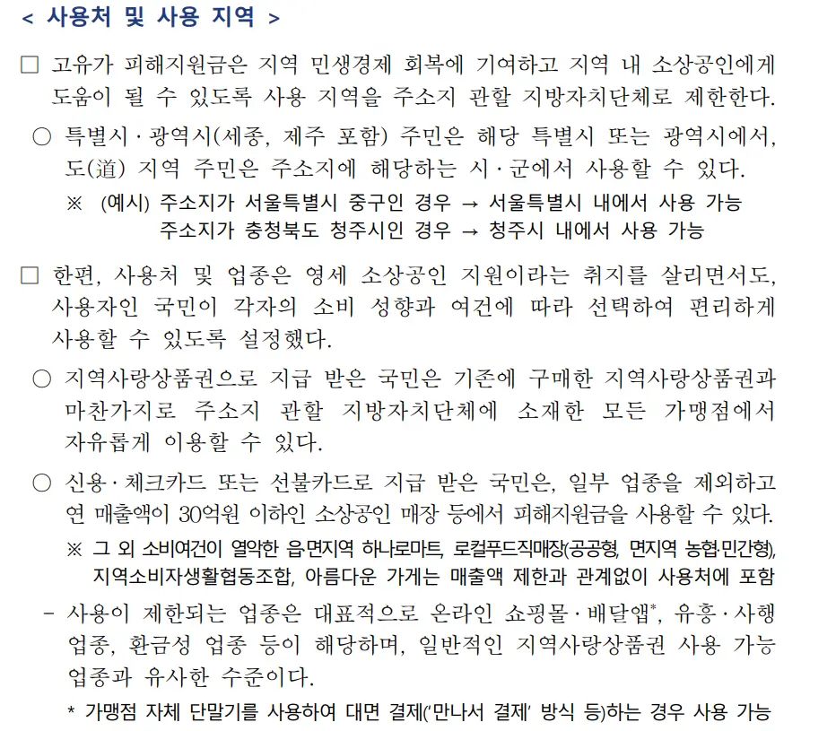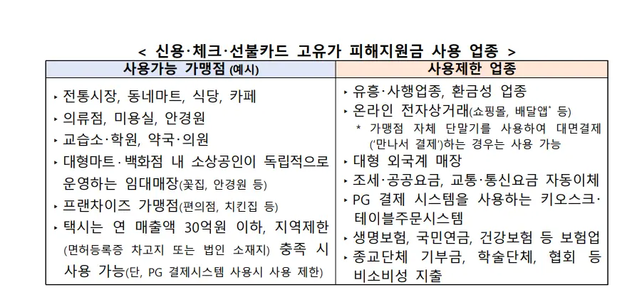 • 사용 불가: 대형마트, 백화점, 온라인 전자상거래, 자동이체, 보험업, 유흥업종