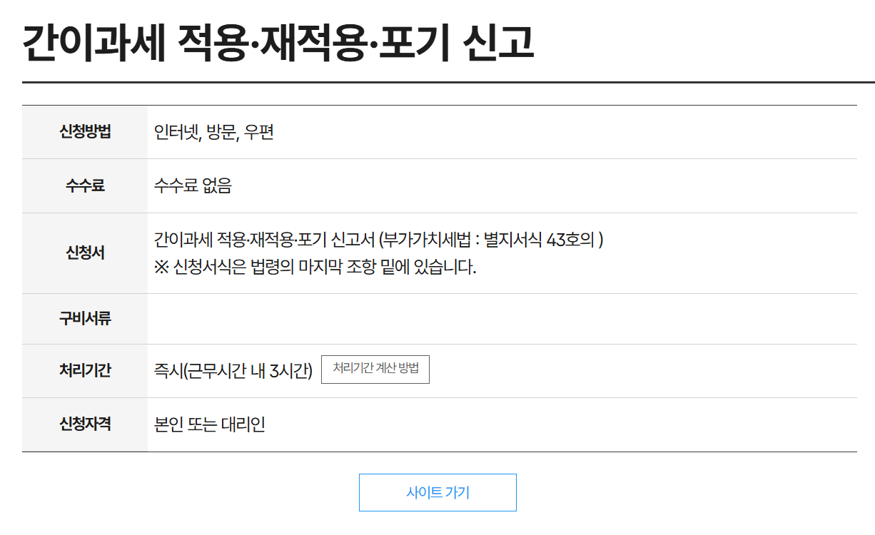- 검색된 ‘간이과세포기신고’ 민원사무의 우측 [인터넷신청] 버튼을 클릭합니다.